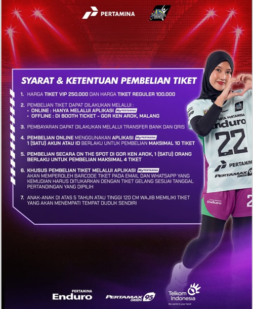 Untuk menyaksikan laga Seri Malang, Manager Corporate Brand PT Pertamina (Persero), Andar Titi Lestari, mengatakan, jika tuan rumah membuka akses penjualan tiket secara luas, terutama online melalui aplikasi MyPertamina sejak 3 Februari maupun offline di booth tiket GOR Ken Arok mulai 4 Februari 2026.