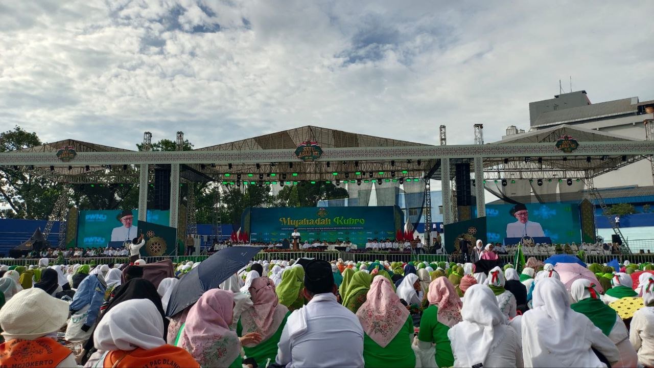 blokBojonegoro.com - Puluhan ribu jamaah Nahdlatul Ulama (NU) memadati Stadion Gajayana, Kota Malang, Minggu (8/2/2026), dalam Mujahadah Kubro puncak peringatan 1 Abad NU. Lautan jamaah berpakaian putih memenuhi tribun hingga lapangan stadion mengikuti doa bersama dan lantunan sholawat meski sempat diguyur gerimis.