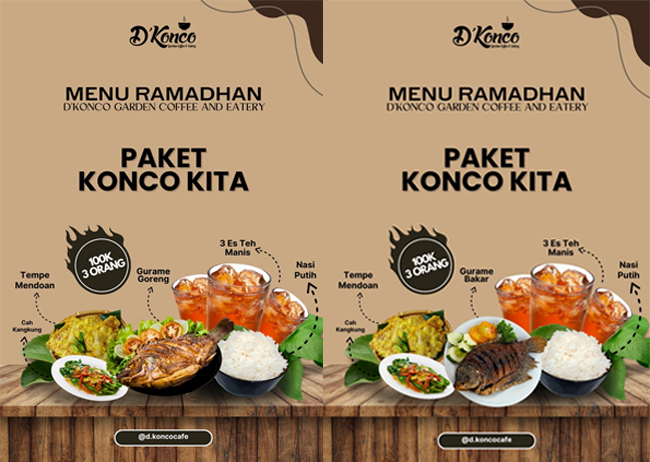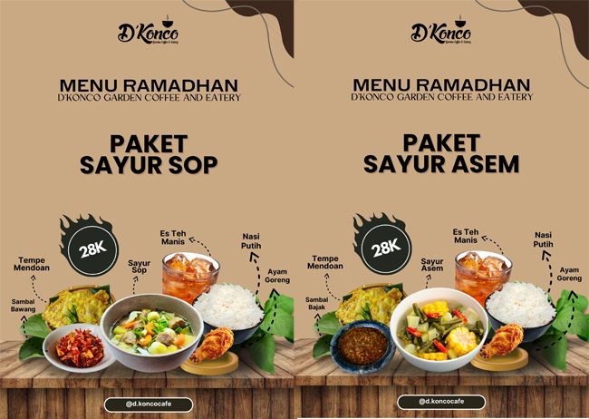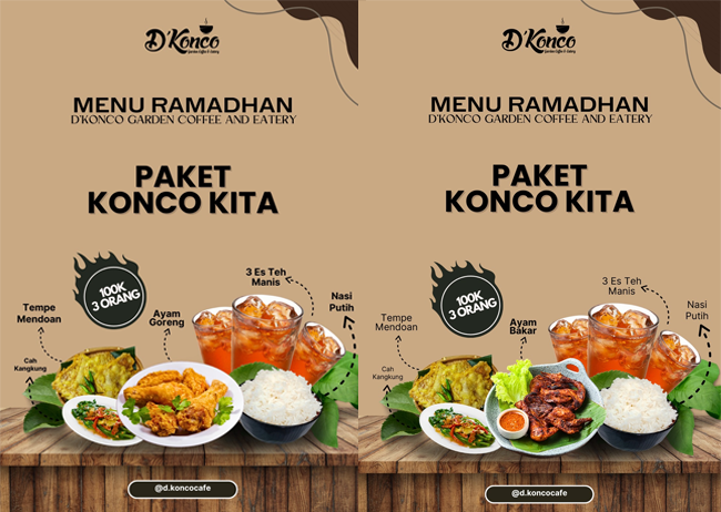 Banyak menu buka puasa yang bisa dipesan atau direservasi untuk makan bersama. Daftar menu lengkap bisa dilihat di @d.konco cafe atau bisa juga di Nomor WhatsApp (WA) 0857-8484-7773.