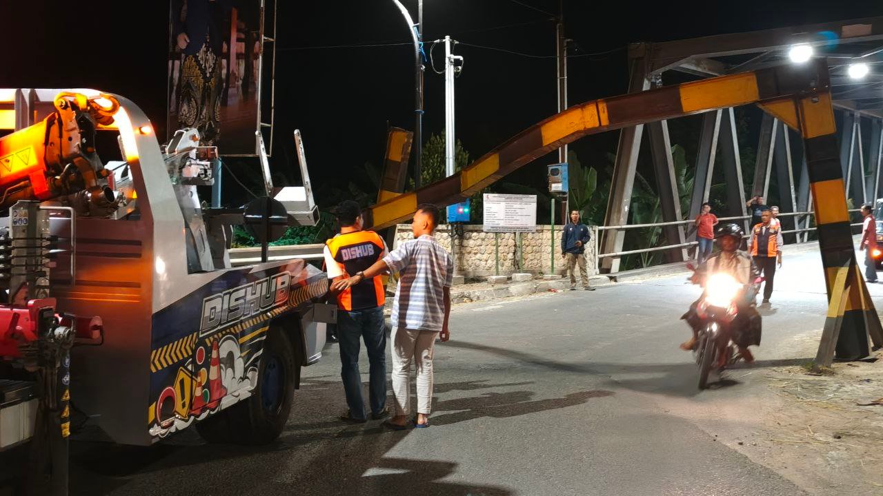 Sejumlah petugas terlihat melakukan pengecekan langsung pada konstruksi portal pembatas tinggi kendaraan. Penanganan dilakukan secara hati-hati agar tidak menimbulkan kemacetan maupun gangguan bagi pengguna jalan yang melintas.