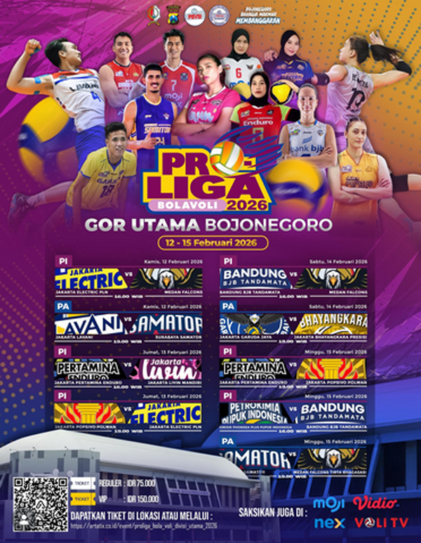 Harga reguler menonton langsung ke GOR Utama Bojonegoro Rp75.000 dan tiket VIP Rp150.000. Bagi yang di rumah, Proliga 2026 juga bisa disaksikan melalui Moji, Video, Nex dan VoliTV. [mad]