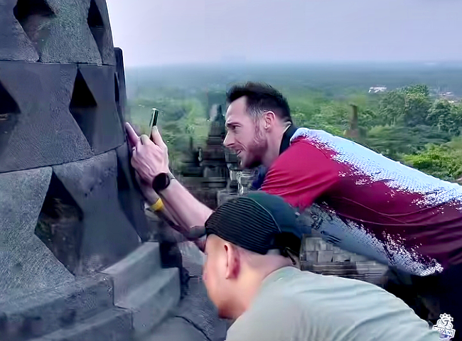 Mereka berjalan menaiki tangga, menjelajahi seluruh pelataran dan dengan seksama memeriksa stupa. Bahkan, David Lee tampak terkagum-kagum dengan panel relief dan patung Buddha.