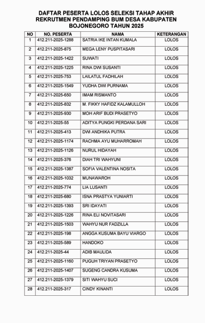 Dari 28 kebutuhan pendamping BUM Desa 2025 di Kabupaten Bojonegoro, sekitar 17 srikandi atau perempuan lolos. Sisanya laki-laki yang nama-namanya bisa dilihat di https://www.blokbojonegoro.com/2025/12/02/inilah-hasil-seleksi-calon-tenaga-pendamping-bum-desa-tahun-2025]