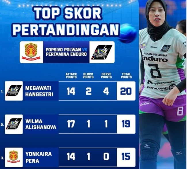 Seperti dilansir akun resmi @mojisports_ inilah Top Skor Pertandingan Popsivo Polwan Vs Jakarta Pertamina Enduro: