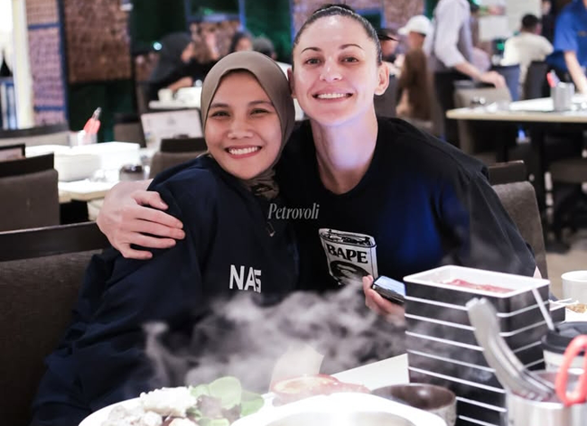 Para pemain yang berhijab seperti Bela Sabrina, Nabila Purwita, Nandita Ayu Salsabila, Siti Romadhani, Syakirah Athania Putriiska, Putri Nur Agustin, hingga setter andalan Arneta Putri Amelian berbaur dengan pemain lain yang ikut makan bersama.
