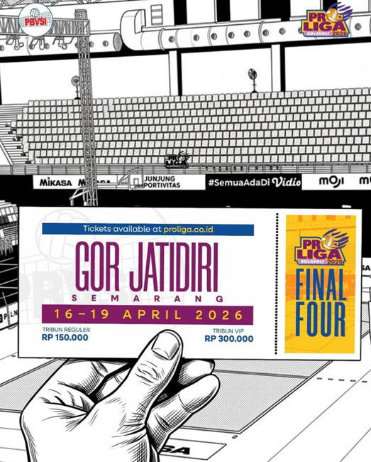 blokBojonegoro.com - Harga tiket babak Final Four kompetisi bola voli Proliga 2026 ditawarkan bervariasi, dengan kategori termurah mulai Rp150.000.