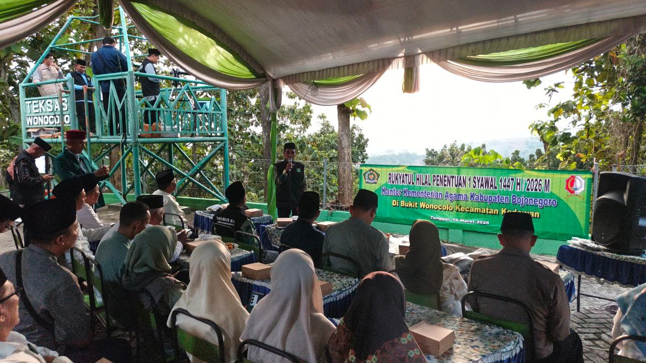 Pemantauan dilakukan di Rumah Singgah Bukit Wonocolo, Kecamatan Kedewan, yang menjadi salah satu titik rukyat di Bojonegoro untuk menentukan awal Hari Raya Idulfitri 1447 H. Kegiatan dihadiri Plt. Kasubag TU Kemenag Bojonegoro, Kasi Bimas Islam, sejumlah tokoh agama, satker KUA, organisasi Islam, forkopimcam, dan juga Pemerintah Desa setempat, yang menjadi salah satu titik rukyat di Bojonegoro untuk menentukan awal Hari Raya Idulfitri 1447 H.