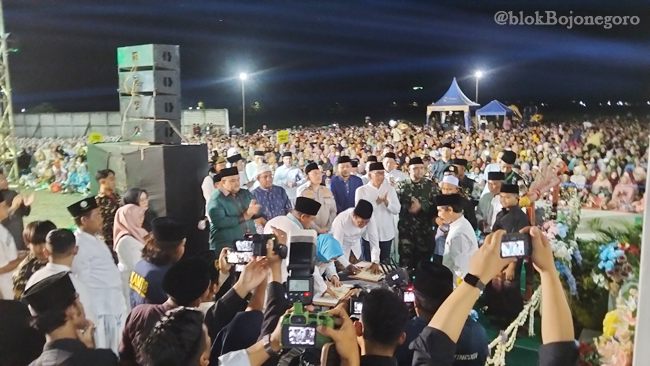 Tampak, prosesi penandatangan penyerahan bangunan masjid kepada Ponpes Abah Anza, panggilan akrab KH. Anwar Zahid, pemotongan pita sampai dengan seremoni penandatangan oleh prasasti oleh Bupati Bojonegoro. [mad]